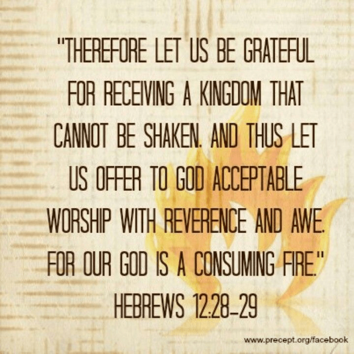 28 Therefore let us be grateful for receiving a kingdom that cannot be shaken, and thus let us offer to God acceptable worship, with reverence and awe, 29 for our God is a consuming fire.